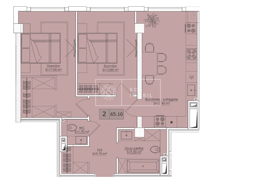 Compartimentare: 2 dormitoare, bucatarie, 2 blocuri sanitare, garderobă, hol.
